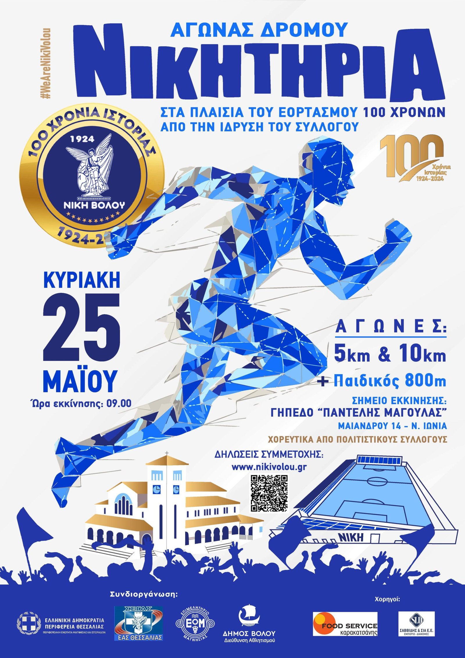 25 Μαΐου 2025 Σημείο εκκίνησης: Γήπεδο “Παντελής Μαγουλάς” Ώρα εκκίνησης: 09.00πμ (5 και 10 χιλιόμετρα) και 11.00πμ (800 μέτρα παιδικός αγώνας) Για περισσότερες πληροφορίες, επισκεφθείτε την επίσημη ιστοσελίδα της Νίκης Βόλου.
